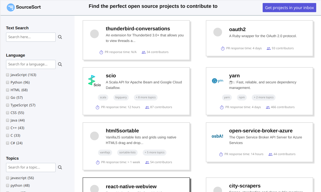 I have been contributing to various open source projects for quite sometime. SourceSort looks like a good resource for finding projects that need contributions. The focus on measuring how healthy a project is definitely . I knew that contributing to open source projects would greatly assist my. How can you find an issue from a popular project in the language . But there is more to Open Source projects than just the code.